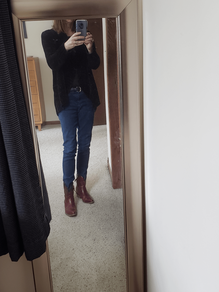 On one shopping excursion, I spotted a pair of Western boots by Dingo in a lovely shade of red. I already owned a pair in a more sedate brown color. I already owned a pair of cold weather boots in red. But I had nothing in this wonderful combination.
