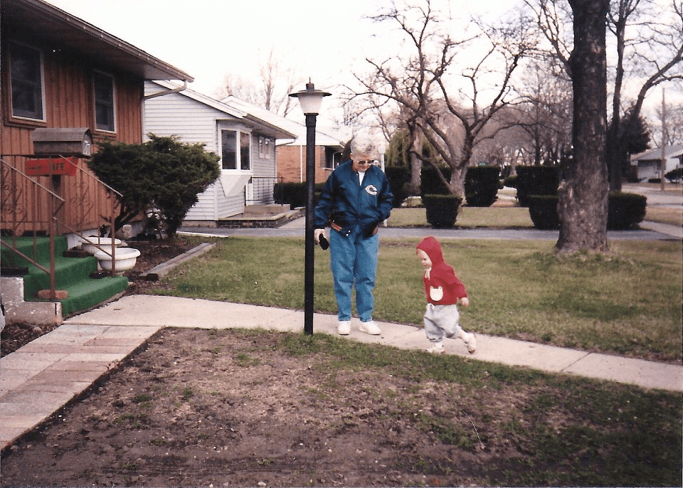 After we were teenagers, my mother went back to work part time for a few years as a receptionist. It wasn’t about the money–my dad earned a decent salary–it was probably for the sociability. Then we started moving away from home. Work, college, marriage, children–her grandchildren. My parents celebrated their 50th wedding anniversary. They were beloved grandparents by that point. Here’s a picture of my mother with my son when he was about three years old. That’s the front of the very same house I grew up in. That’s Irene and that’s my son, happy to be free after hours in the car, driving from Wisconsin.